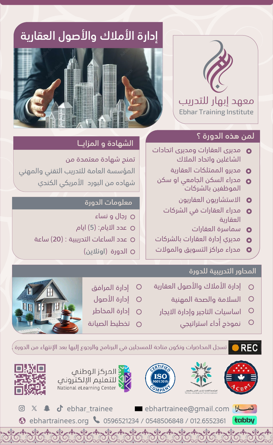 الهدف العام من البرنامج التدريبى تمكين المشاركين ببرنامج تدريبي يتناول موضوع ادارة الممتلكات او الاملاك والاصول العقارية يشرح عملية ادارة الاملاك العقارية وادارة عمليات الصيانة للعقارات وفق خطة علمية مدروسة