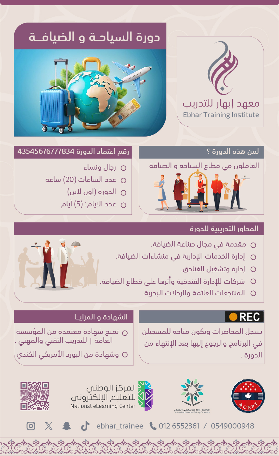 تمكين المشاركين من فهم أساسيات وممارسات قطاع السياحة والضيافة وتطوير مهاراتهم الإدارية والفنية بما يعزز جودة الخدمات ويواكب التطورات الحديثة في مجال صناعة السياحة